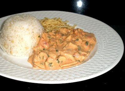 Deixe o bacalhau de molho em água por 24 horas, trocando a água a cada 4 horas. Afervente, desfie grosseiramente e reserve. Em uma panela, refogue a cebola e o alho no azeite. Acrescente o tomate e cozinhe até desmanchar. Adicione o conhaque, tempere com sal, orégano, alecrim e pimenta. Junte o cheiro-verde, o bacalhau e o champignon. Tampe a panela e deixe apurar. Retire do fogo, acrescente o queijo ralado e o creme de leite. Misture bem e sirva acompanhado de arroz branco e batata-palha.